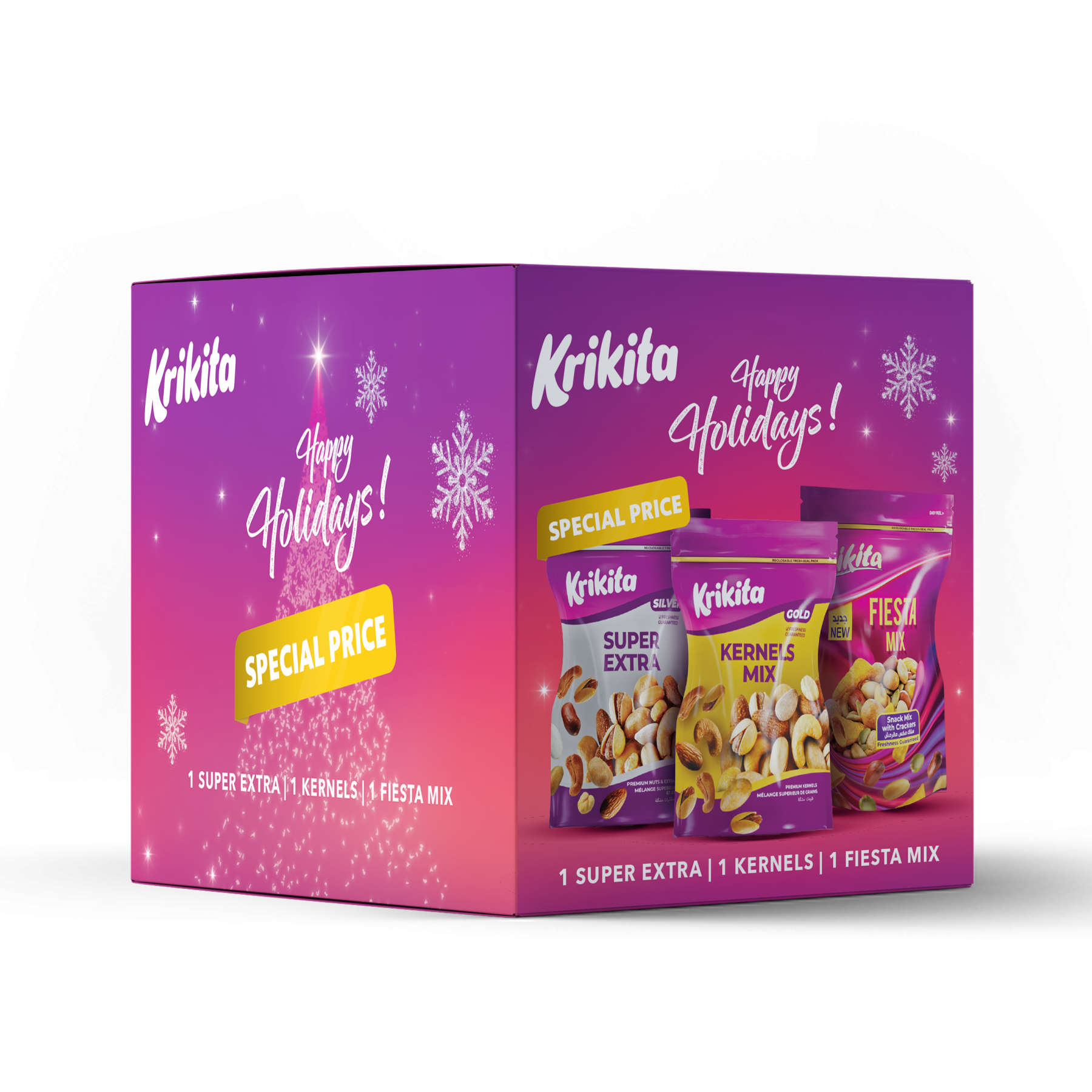 Celebrate the holidays with the KRIKITA Promo Box, a festive trio featuring Gold 250g, Silver 20g, and Fiesta Mix 200g. The perfect blend of flavor, cheer, and gifting delight.